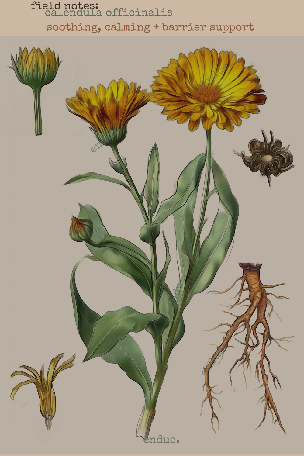 calendula officinalis is associated with wound support, anti-inflammatory activity, and mild antimicrobial effects. it is commonly used to soothe irritated or compromised skin and support tissue repair.