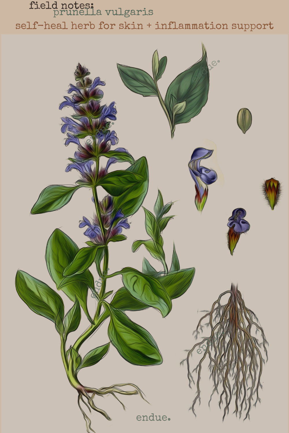 prunella vulgaris demonstrates antiviral, astringent, and anti-inflammatory activity. it is traditionally used for wound care, tissue repair, and inflammatory skin conditions.